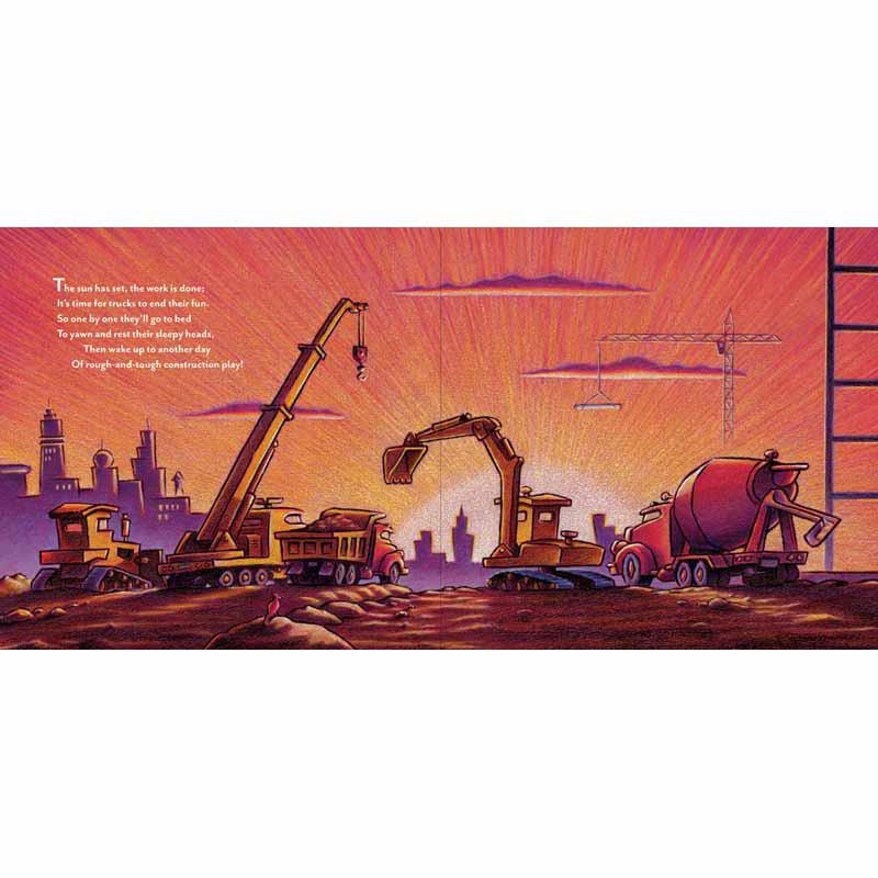 As the sun sets behind the big construction site, all the hardworking trucks get ready to say goodnight. One by one, Crane Truck, Cement Mixer, Dump Truck, Bulldozer, and Excavator finish their work and lie down to rest-so they'll be ready for another day of rough and tough construction play! With irresistible artwork by best-selling illustrator Tom Lichtenheld and sweet, rhyming text, this book will have truck lovers of all ages begging for more.