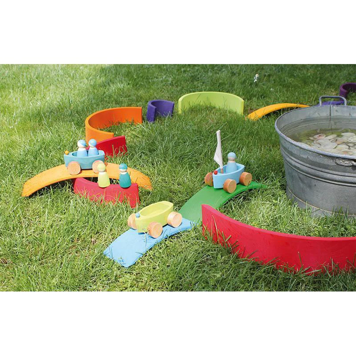 The perfect addition to your building block sets and vehicle collection. Use these rainbow bridge pieces to make roads, cradles, tunnels, rivers, and ramps — wherever your imagination takes you. Sturdy alder wood construction with bright water-based stains, and a simple and warm oil finish that lets the natural character of the wood and design shine through.