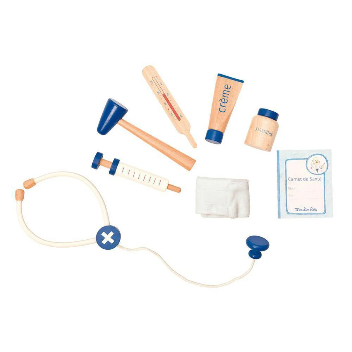 From Moulin Roty comes this beautiful doctor's set in its very own suitcase. Treat all of your teddy bears boo boos with this thoughtfully assembled kit. This decorated suitcase has been printed to match the Grande Famille line of toys and is made from sturdy card with a handle and latch. Included in the medical kit is a wooden thermometer, tablet bottle, stethoscope, syringe, reflex hammer, tub of cream, as well as a health record book.
