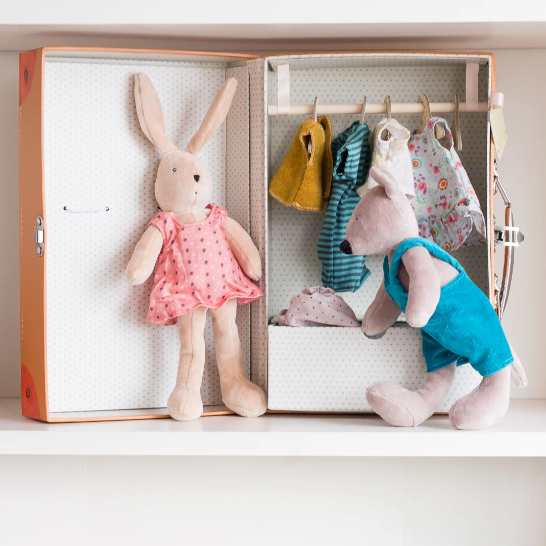 This unique wardrobe suitcase from French company Moulin Roty has everything you need for playtime dress-up included inside! Open up this cute decorative suitcase to find inside a Sylvain rabbit (20cm) and Nini mouse, as well as a selection of their clothes. There is a drawer and hangers to put everything away nicely when finished picking the outfits for your little friends. Mix and match pieces and take the case along with you anywhere for some imaginary playtime!