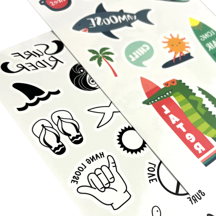 Ride the temporary tattoo wave with these seriously silly beach inspired designs! Three tattoo sheets are included - two in color and one in black and white. Durable and long lasting, these can turn a rainy afternoon into a day at the beach! You know whatâs great about long, happy days at the beach? Anything goes! These temporary tattoos for kids capture the beachy vibes of those fun in the sun days. From cool sayings like âlong hair donât care,â to silly designs like a frog riding a wave and a surfing sun telling you to chill, this set of three tattoo sheets is all about having a good time. Designed to be long lasting and durable, these temporary tattoos make a great party favor or a thoughtful treat for those kiddos who believe the beach is their happy place.