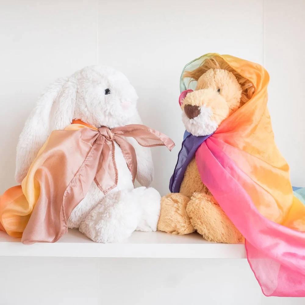 Sarah's Silks mini playsilks are 21" squares that are dyed with non-toxic, eco-friendly dyes. One of the most versatile toys, one moment playsilks are a canopy to sit under, the next they are boiling lava to jump over. One can be grass to feed your horse, and another might be a doll carrier, a cape, or soup in a pot! The play options with playsilks are as limitless as your imagination. Available in a rainbow of colours, choose your favourite or collect a variety for even more fun.Â