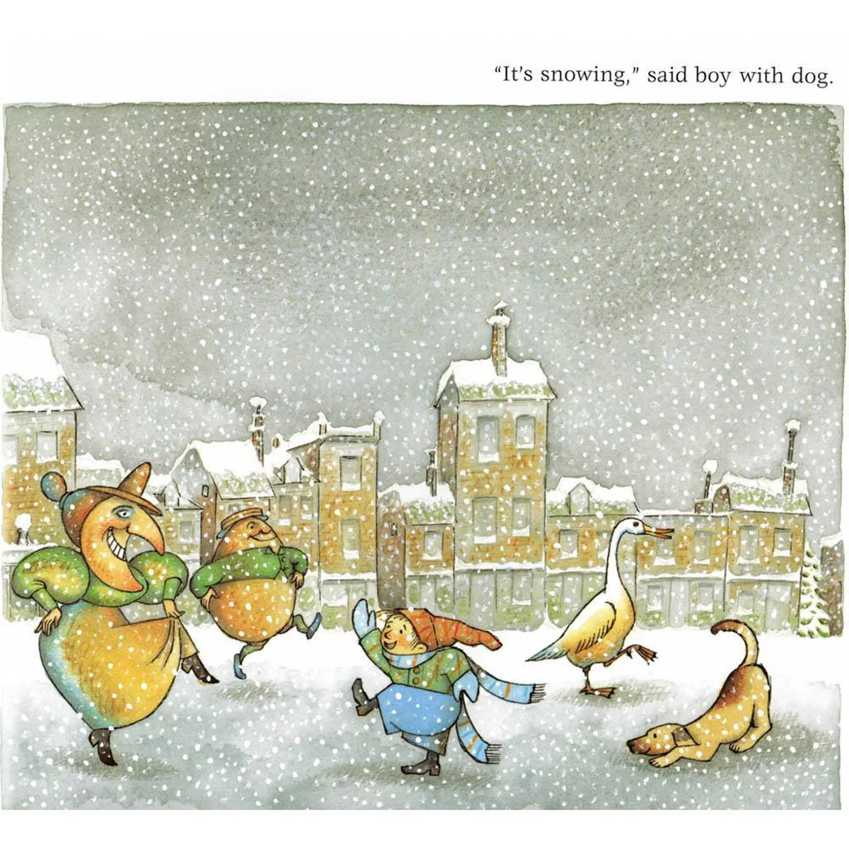 Normally it doesn't snow very much on the city; a snowflake here, a snowflake there. Follow along as one little boy and his dog notice that a snowflake here and a snowflake there have multiplied to quite the flurry. No one is prepared for a proper snowfall - not the man with the hat, not the woman with the umbrella. But the little boy and his dog have faith that the snow falling is going to amount to something spectacular. As it turns out, the boy and his dog seem to be the only two who know how to enjoy this magical event!