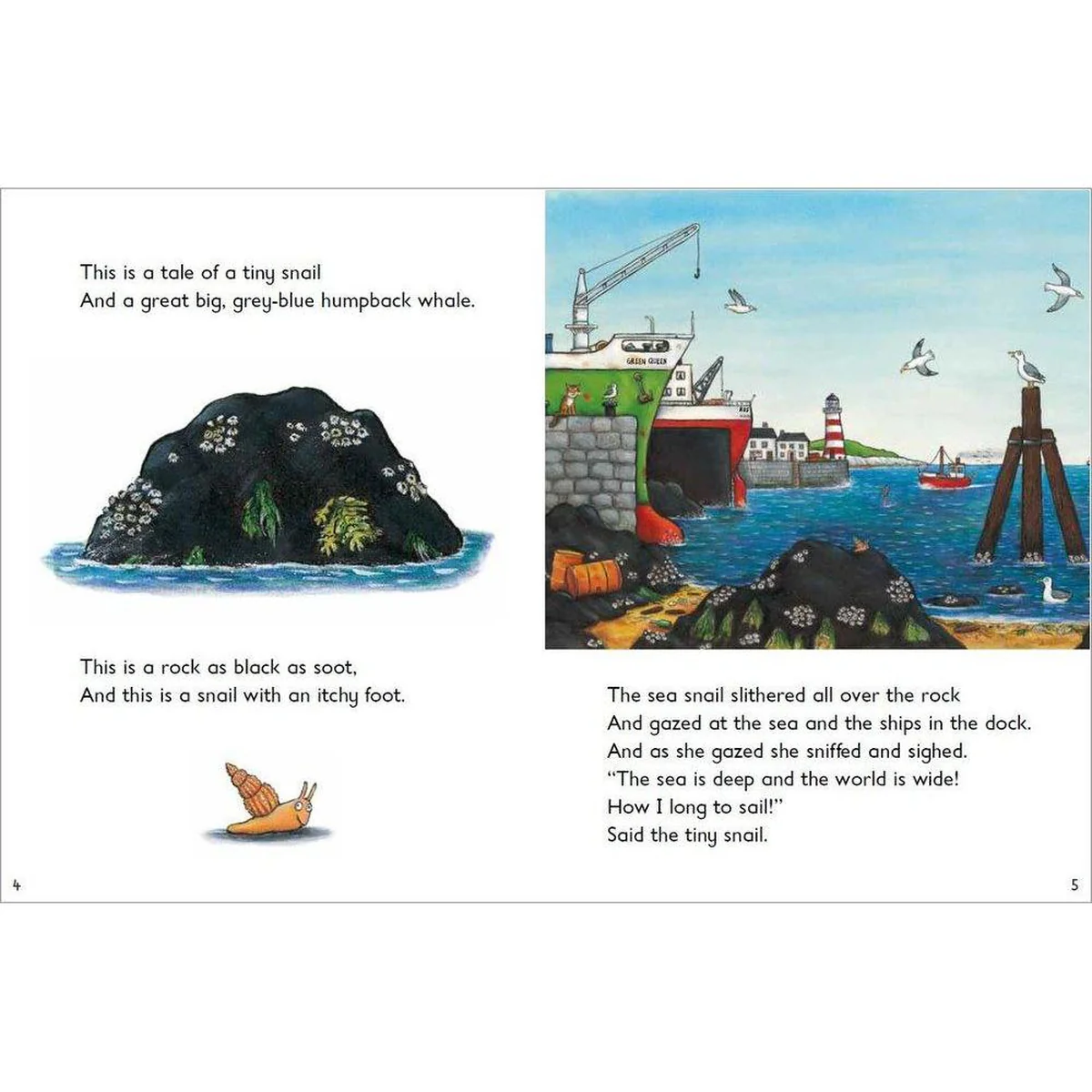 When one little snail longs to see the big wide world, she hitches a lift on the tail of an enormous whale. Together, they set sail on an amazing journey, past icebergs and volcanoes, sharks and penguins, and the little snail feels so small in the vastness of the world. But when disaster strikes and the whale is beached in a bay, it’s up to the tiny snail to save the day.