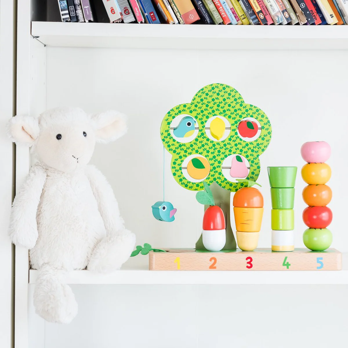 Learn to count and learn your veggies at the same time! This clever garden stand comes with interactive fruits and birds in the tree and a whole plot of veggies.Ā Count and stack the vegetable pieces onto the wooden pegs and dig under the dirt of number 1 to reveal a potato! This is a beautiful and colourful early learning toy.Ā